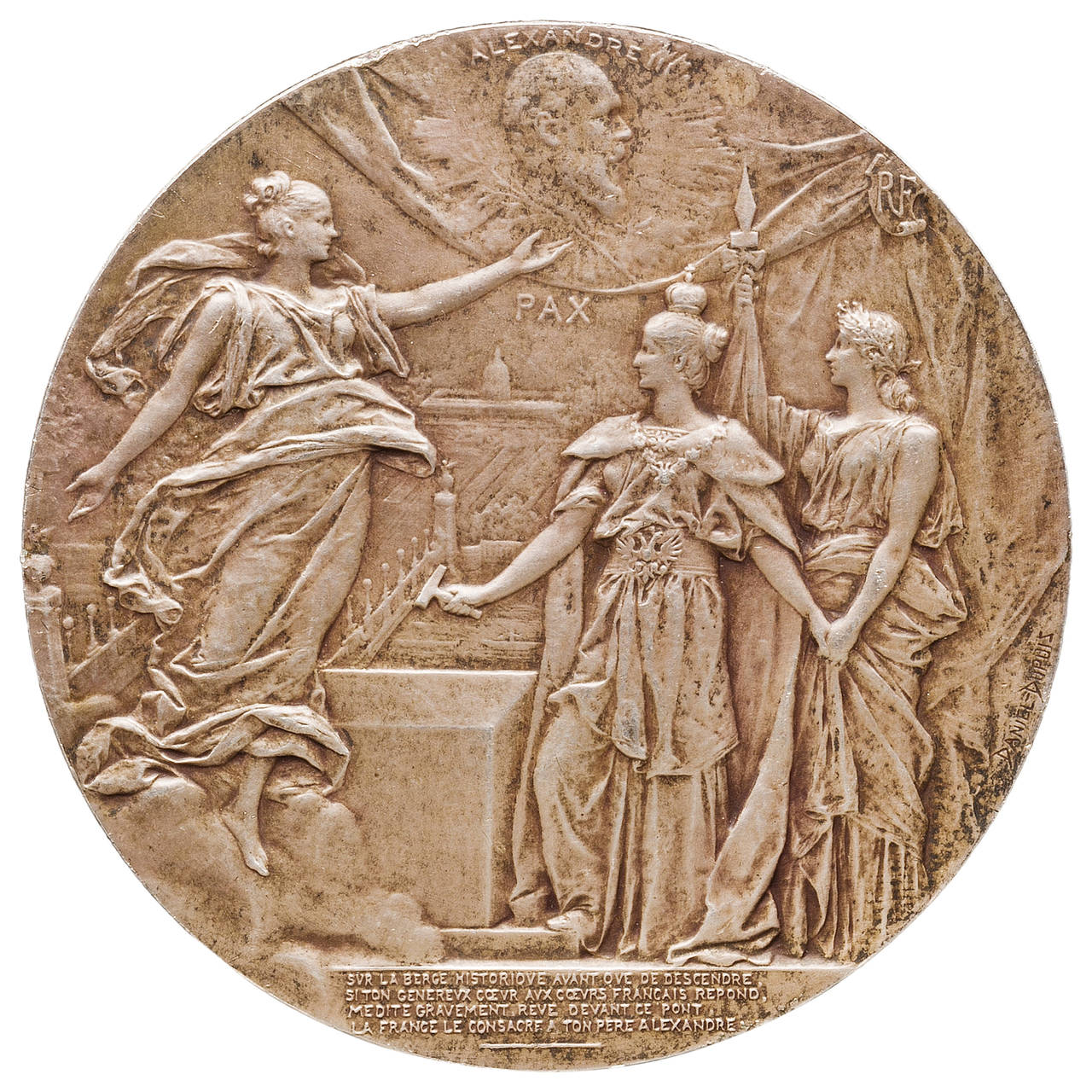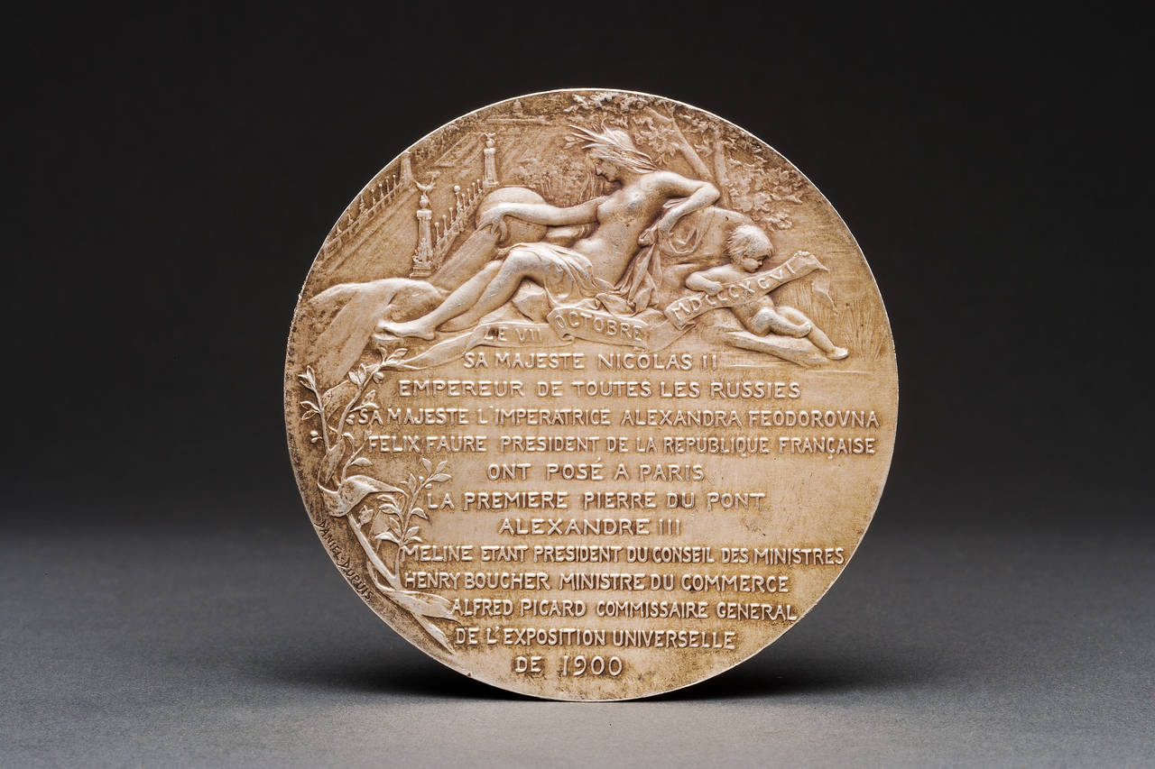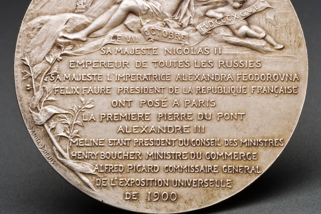 In silvered bronze, a table medallion commemorating Nicholas and Alexandra’s visit to Paris to lay the first stone on the Alexander III bridge in 1896, with dedication inscriptions in French, front and back.